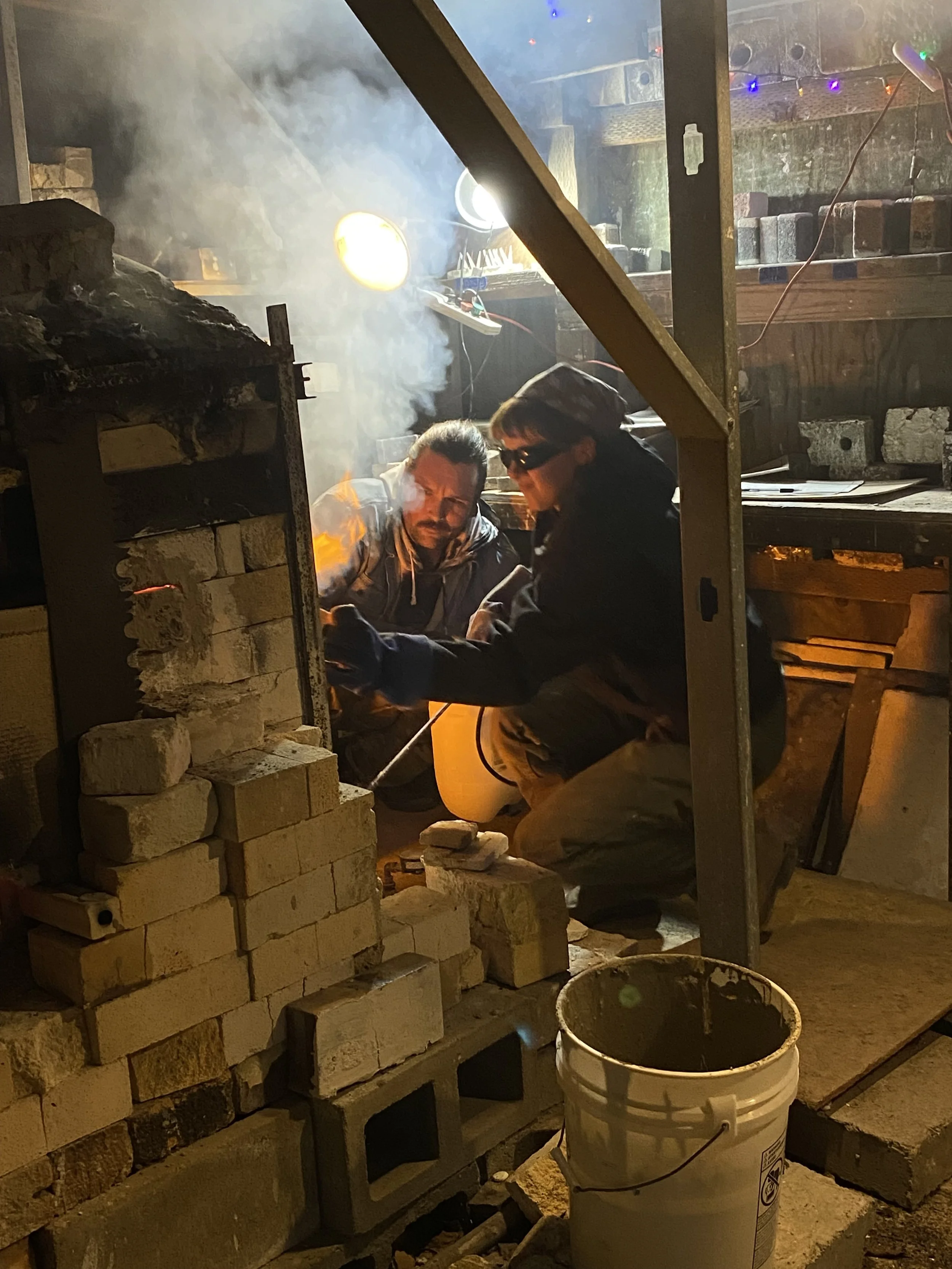 I recently got to be on the firing team for a soda firing at the compound. For those unaware, soda firing is a type of gas firing that introduces a soda mixture (sodium bicarbonate, soda ash, magnesium carbonate occasionally) near the peak temperature of the sequence. The mixture volatilizes and reacts with the glazes and clay body, providing one-of-a-kind finishes for the work.